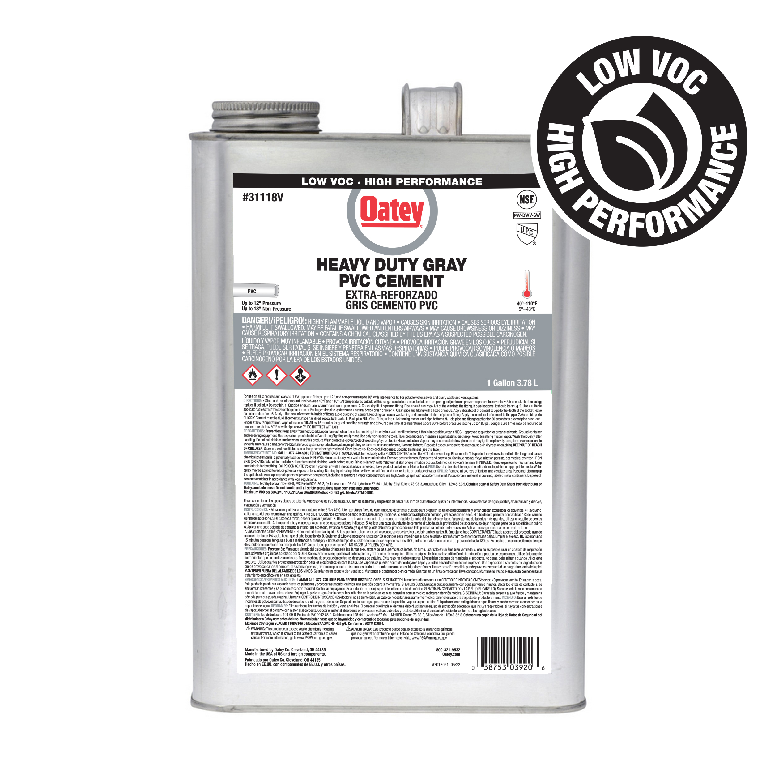 El cemento de CPVC gris resistente de grado industrial Oatey® está recomendado para aplicaciones que requieran resistencia química a productos cáusticos, como hipoclorito, ácidos minerales y soluciones salinas acuosas. Se puede utilizar con todos los materiales de PVC y CPVC, incluidos los sistemas de tuberías de CPVC Corzan®, y es fácil de aplicar con la espátula incluida en la tapa. Su indicador UV permite inspeccionar rápida y fácilmente las juntas de ajuste en seco utilizando cualquier fuente de luz ultravioleta. Este cemento gris, de bajo COV y gran cuerpo, puede utilizarse para soldar con disolvente tuberías y accesorios de CPVC de las clases 40 y 80 y tuberías y accesorios de PVC de hasta 12 pulg. de diámetro, así como de otras clases y clases con ajuste de interferencia. Es resistente a cáusticos e hipocloritos hasta un 15% de solución. Consulta la Tabla de Resistencia Química EP 42 para comprobar la compatibilidad antes de utilizarlo con soluciones químicas. Los productos Oatey se han ganado la confianza de los profesionales de la fontanería durante más de 100 años.