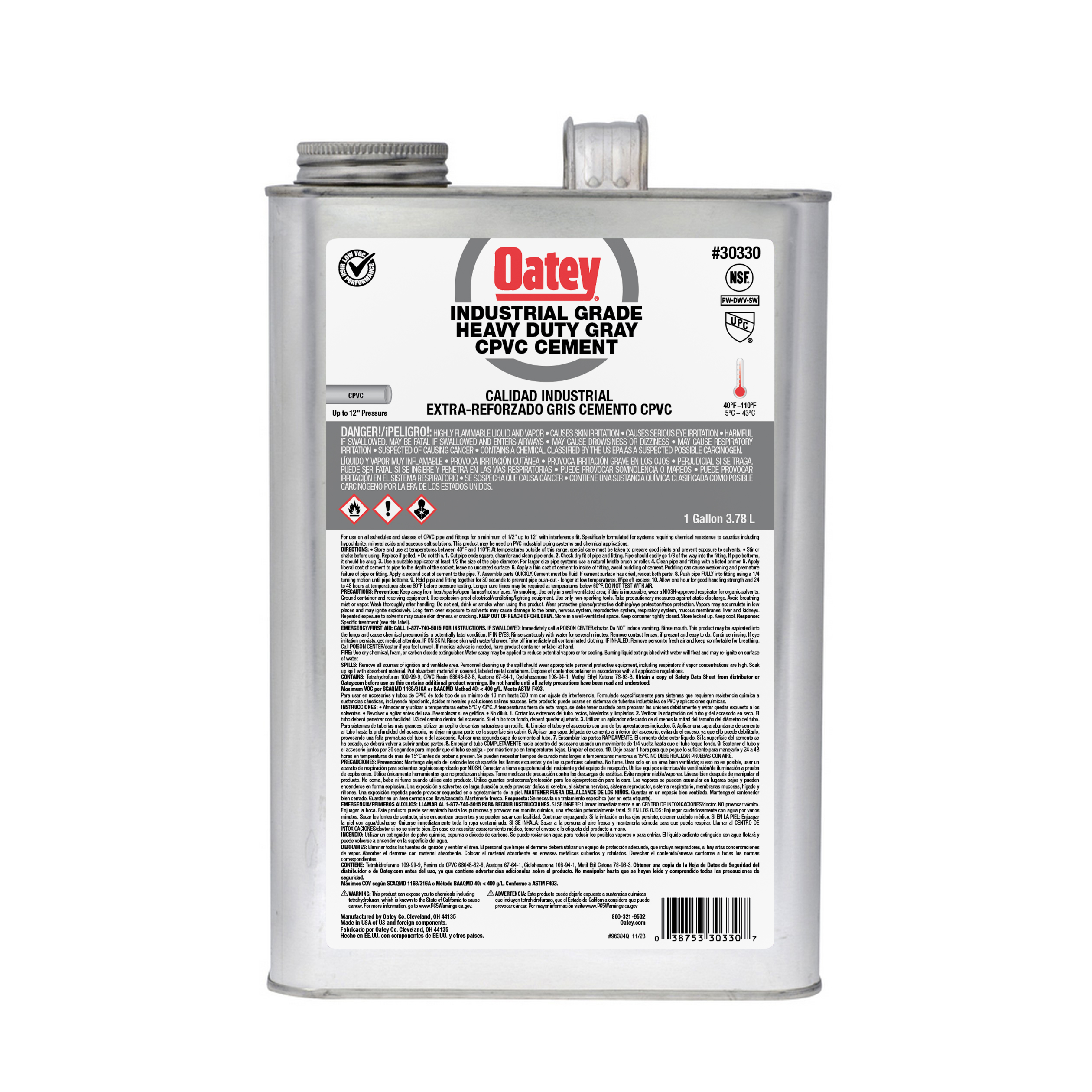 El cemento de CPVC gris resistente de grado industrial Oatey® está recomendado para aplicaciones que requieran resistencia química a productos cáusticos, como hipoclorito, ácidos minerales y soluciones salinas acuosas. Se puede utilizar con todos los materiales de PVC y CPVC, incluidos los sistemas de tuberías de CPVC Corzan®, y es fácil de aplicar con la espátula incluida en la tapa. Su indicador UV permite inspeccionar rápida y fácilmente las juntas de ajuste en seco utilizando cualquier fuente de luz ultravioleta. Este cemento gris, de bajo COV y gran cuerpo, puede utilizarse para soldar con disolvente tuberías y accesorios de CPVC de las clases 40 y 80 y tuberías y accesorios de PVC de hasta 12 pulg. de diámetro, así como de otras clases y clases con ajuste de interferencia. Es resistente a cáusticos e hipocloritos hasta un 15% de solución. Consulta la Tabla de Resistencia Química EP 42 para comprobar la compatibilidad antes de utilizarlo con soluciones químicas. Los productos Oatey se han ganado la confianza de los profesionales de la fontanería durante más de 100 años.