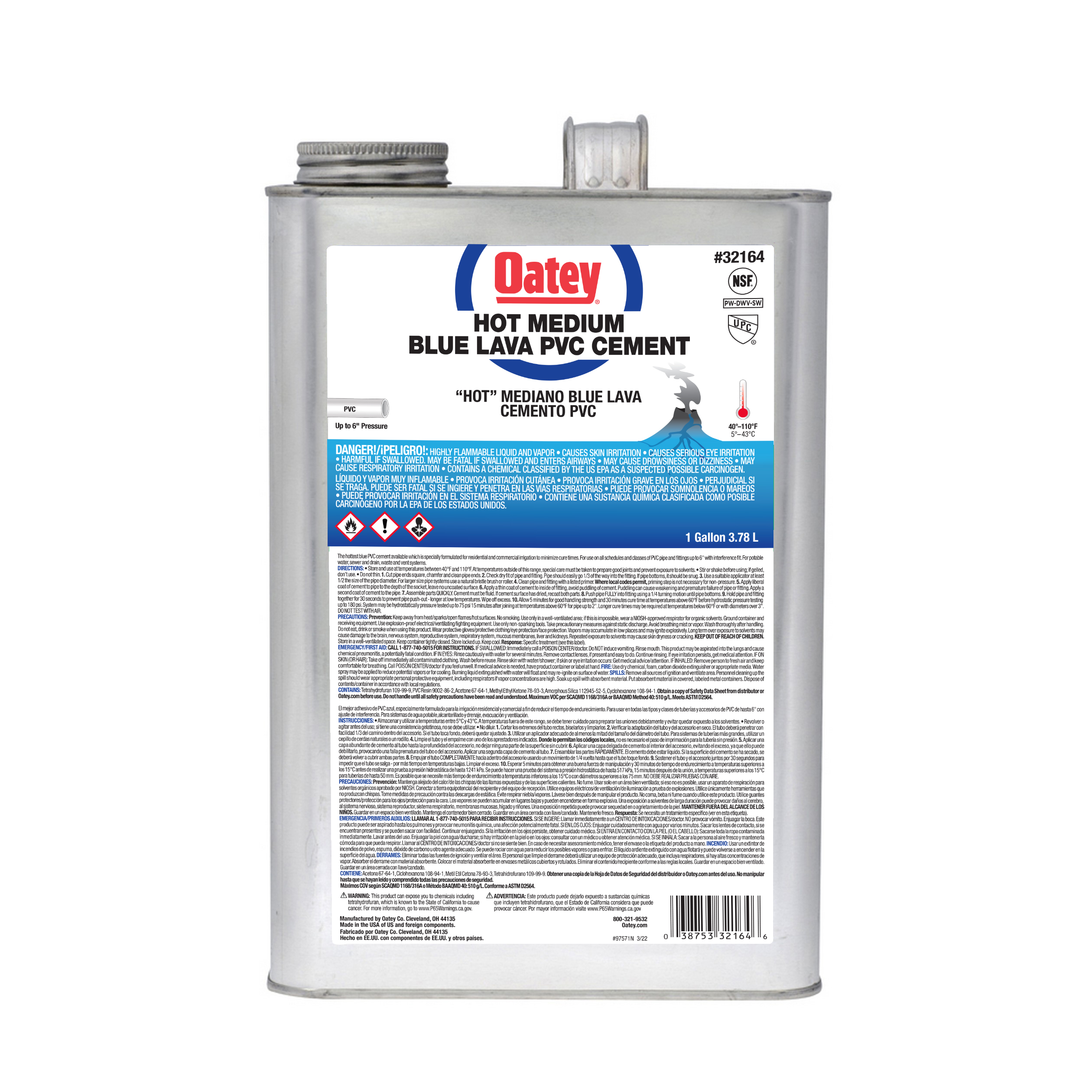 El Cemento Caliente de Fraguado Rápido Oatey® Lava Azul de Cuerpo Medio está recomendado para la reparación de tuberías de desagüe, riego y aplicaciones en piscinas y spas. Está formulado para condiciones húmedas, presurización rápida e instalación rápida, y es fácil de aplicar con la espátula incluida en la tapa. Este cemento de PVC azul, de cuerpo medio y fraguado muy rápido, puede utilizarse para soldar con disolvente todos los tipos y clases de tuberías y accesorios de PVC de hasta 15 cm de diámetro con ajuste de interferencia. Los productos Oatey se han ganado la confianza de los profesionales de la fontanería durante más de 100 años.